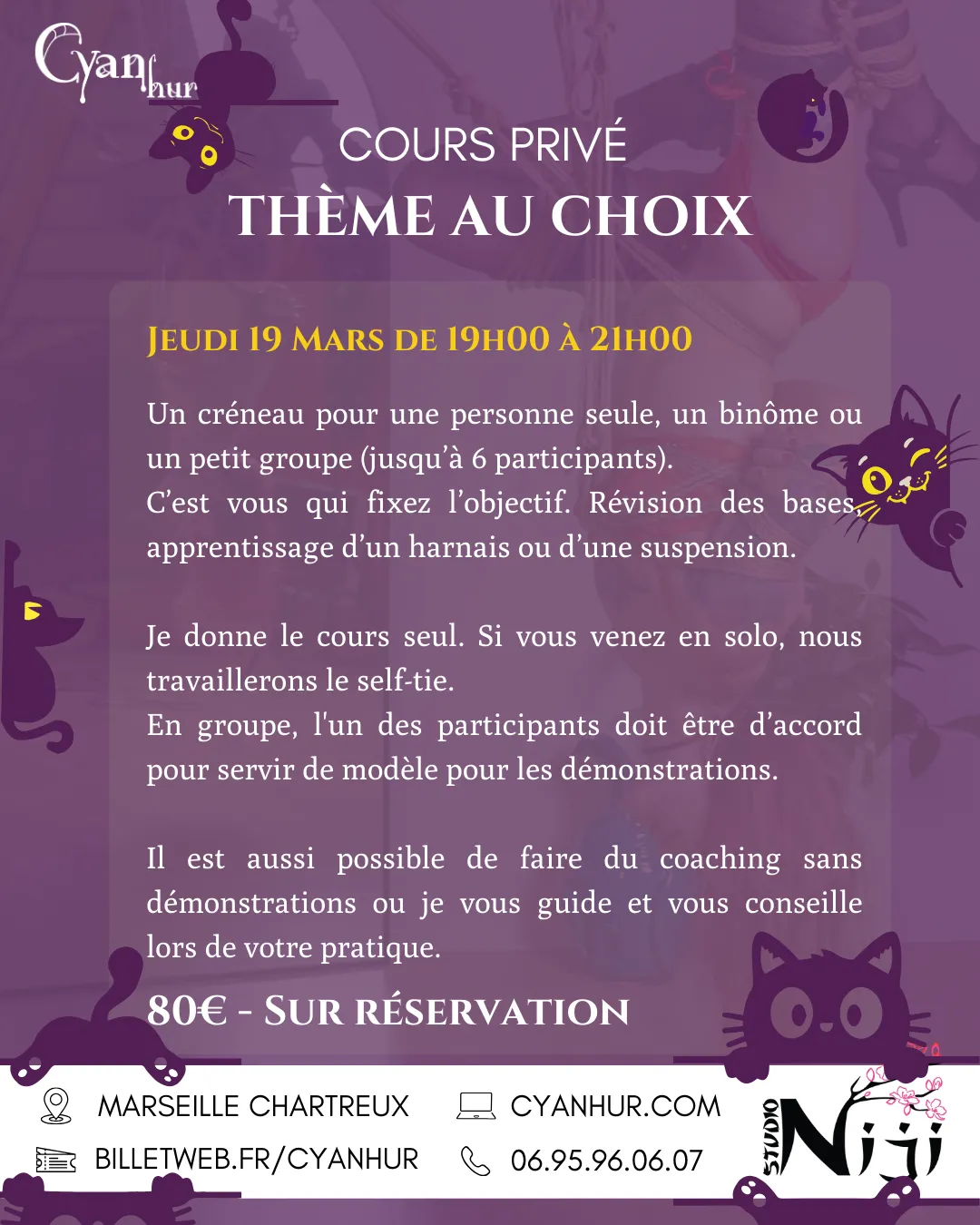 Je vous guiderai pas à pas dans l’apprentissage des différents harnais de base et des positions les plus courantes. Mais apprendre le shibari comprend bien plus que le maniement des cordes : la sécurité et le consentement en sont des valeurs fondamentales, que je transmets lors de mes cours.